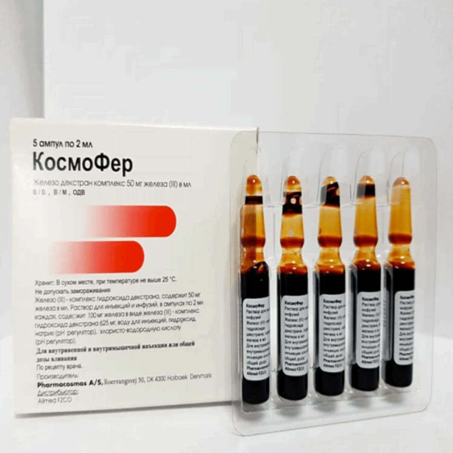 Раствор КосмоФер для инъекций содержит железо в виде стабильного комплекса железа (III) - гидроксид декстрана, пригодного, как для внутривенного, так и внутримышечного применения. Важным преимуществом препарата является то, что железо в комплексе представлено в неионной водорастворимой форме и обладает очень низкой токсичностью. Комплекс железа (III) - гидроксид декстрана по своей химической структуре является аналогом физиологического комплекса ферритина с железа (III) - гидроксидом. В организме ферритин, связывая гидроксид Fe (III), обеспечивает обезвреживание токсичных ионов железа.